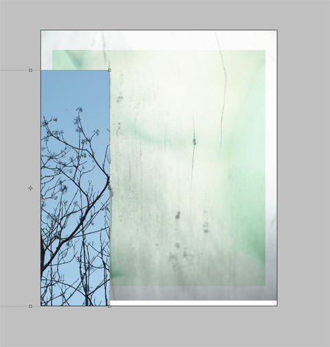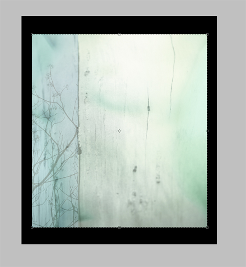 7. With all of the elements in place, I cropped the excess from the edges, and did some very slight (eraser tool at about 9%) blending at the top and down the “seam”.